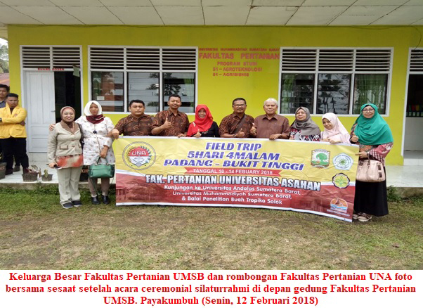 Payakumbuh. Dalam rangka meningkatkan tali silaturahmi antar lembaga pertanian, Fakultas Pertanian Universitas Asahan (FP-UNA) melakukan kunjungan ke Fakultas Pertanian Universitas Muhammadiyah Sumatera Barat (FP-UMSB) pada Senin, 12 Februari 2018. Rombongan ini dipimpin langsung oleh dekan Fakultas Pertanian UNA (Safruddin, S.P., M,MA) yang didampingi oleh beberapa dosen dan karyawan dari fakultas tersebut.