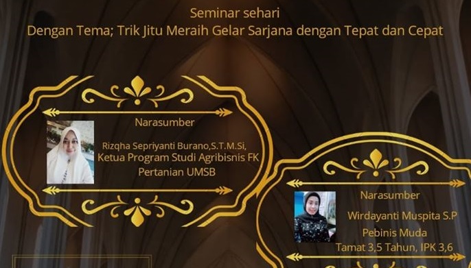 Seminar Online dari HIMAGRi ( Himpunan Mahasiswa Agribisnis) Universitas Muhammadiyah Sumatera Barat dilaksanakan pada hari jumat,22 Mei 2020 jam 10.00 pagi dengan narasumber Rizqha Sepriyanti Burano, S.T M.Si Ketua Program Studi Agribisnis Fakultas Pertanian Universitas Muhammadiyah sumatera Barat, dan Wirdayanti Muspita S.P pebisnis Muda Tamat 3.5 Tahun IPK 3,6.