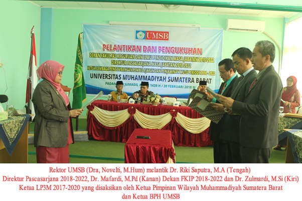 Hadir dalam acara pelantikan yang diselenggarakan pada Selasa 20 Februari 2018 di Ruang Seminar UMSB itu Ketua Pimpinan Wilayah Muhammadiyah (PWM) Sumatera Barat Dr. H. Shofwan Kharim Elhusen, M.A, Ketua Badan Pembina Harian (BPH) UMSB Drs, RB Khatib Pahlawan Kayo, Rektor UMSB Dra, Novelti, M.Hum, dekan-dekan, dosen dan karyawan dilingkungan UMSB. Sedangkan personalia yang dilantik adalah Dr. Riki Saputra, M.A sebagai Direktur Pascasarjana UMSB periode 2018-2022, Dr. Mafardi, M.Pd sebagai Dekan FKIP UMSB periode (2018-2022) dan Dr. Zulmardi, M.Si sebagai ketua LP3M periode 2017-2020.