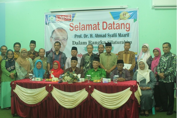 Padang. Sebagai upaya peningkatan mutu dan kualitas tenaga pendidik, Universitas Muhammadiyah Sumatera Barat (UMSB) menggelar pertemuan, silaturahim dan ramah tamah dengan mantan Ketua Umum Pimpinan Pusat Muhammadiyah periode 2000-2005 Prof. Dr. H. Ahmad Syafii Maarif, M.A. Hadir juga pada acara tersebut Ketua Umum Pimpinan Wilayah Muhammadiyah (PWM) Sumatera Barat Dr. H. Shofwan Kharim Elhusen, M.A, Ketua Badan Pembina Harian (BPH) UMSB Drs. RB Khatib Pahlawan Kayo dan jajarannya, Rektor UMSB Dra. Novelti, M.Hum dan jajarannya, Dekan-dekan, para kepala prodi, dosen dan karyawan di lingkungan Universitas Muhammadiyah Sumatera Barat.