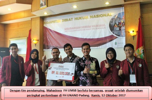 Padang. Tim debat dari Fakultas Hukum Universitas Muhammadiyah Sumatera Barat (FH UMSB) berhasil meraih juara 1 dalam ajang Kompetisi Debat Hukum Nasional 2017 yang diselenggarakan oleh Komunitas Basilek Lidah Universitas Andalas (KOMBAD UNAND) bekerja sama dengan PT Semen Padang, Hakim Mahkamah Konstitusi (H-MK) dan Komisi Pemberantasan Korupsi (KPK) Padang (Selasa-Kamis, 10-12 Oktober 2017).